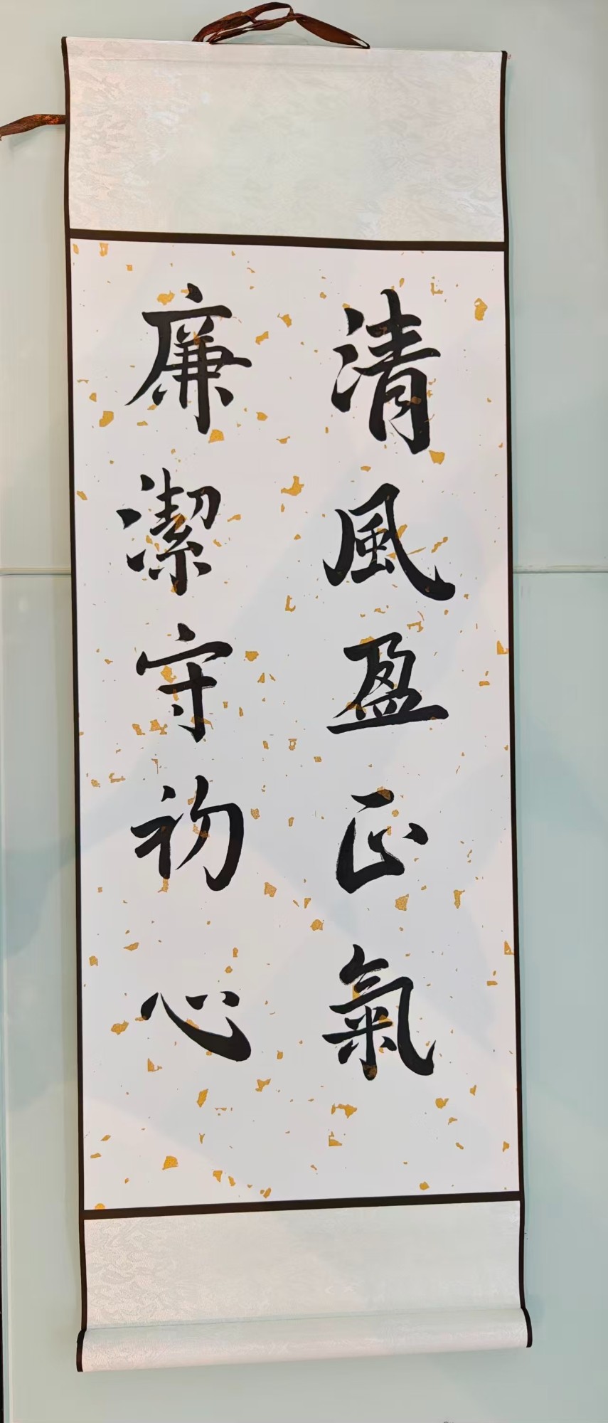 作品簡介:這幅書法以“清風盈正氣,廉潔守初心”為主題,筆墨清朗,風骨錚錚,如金融之舟行于碧水,唯清風可揚帆,唯正氣能定向。字里行間,廉而不冽,潔而不孤,初心若錨,穩泊于喧囂之外。懸于廳堂,不指一事一物,卻使萬端生意皆在靜默中自律;觀于片刻,可令心塵頓洗,長留清輝。讓清風穿過年報,讓正氣充盈合同,以租賃之筆,畫金融凈土。愿我司與同業共沐此風,市場浩瀚,皆成清流。