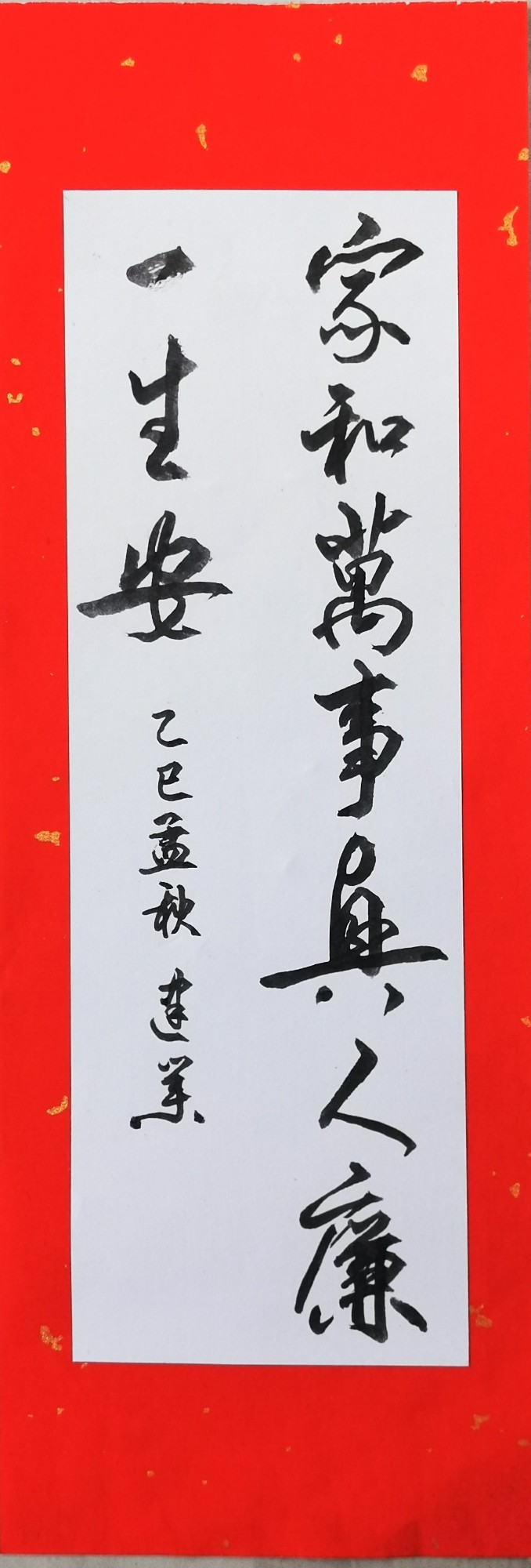 作品簡介:上聯“家和萬事興”,道出家庭和睦乃事業昌隆之基石,是傳承千載的治家智慧;下聯“人廉一生安”,則深刻揭示了清廉正直是個人安身立命、心境坦然的根本。兩者并行,由內至外,共同構筑了圓滿人生的崇高境界,是一份對美好生活的祝愿和修身齊家的格言,寓意著清廉自律方能帶來內心長久的安寧與家庭的興旺。